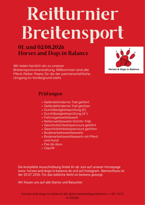 Wir laden herzlich ein zu unserer Breitensportveranstaltung. Willkommen sind alle Pferd-Reiter-Paare, für die der partnerschaftliche Umgang im Vordergrund steht.